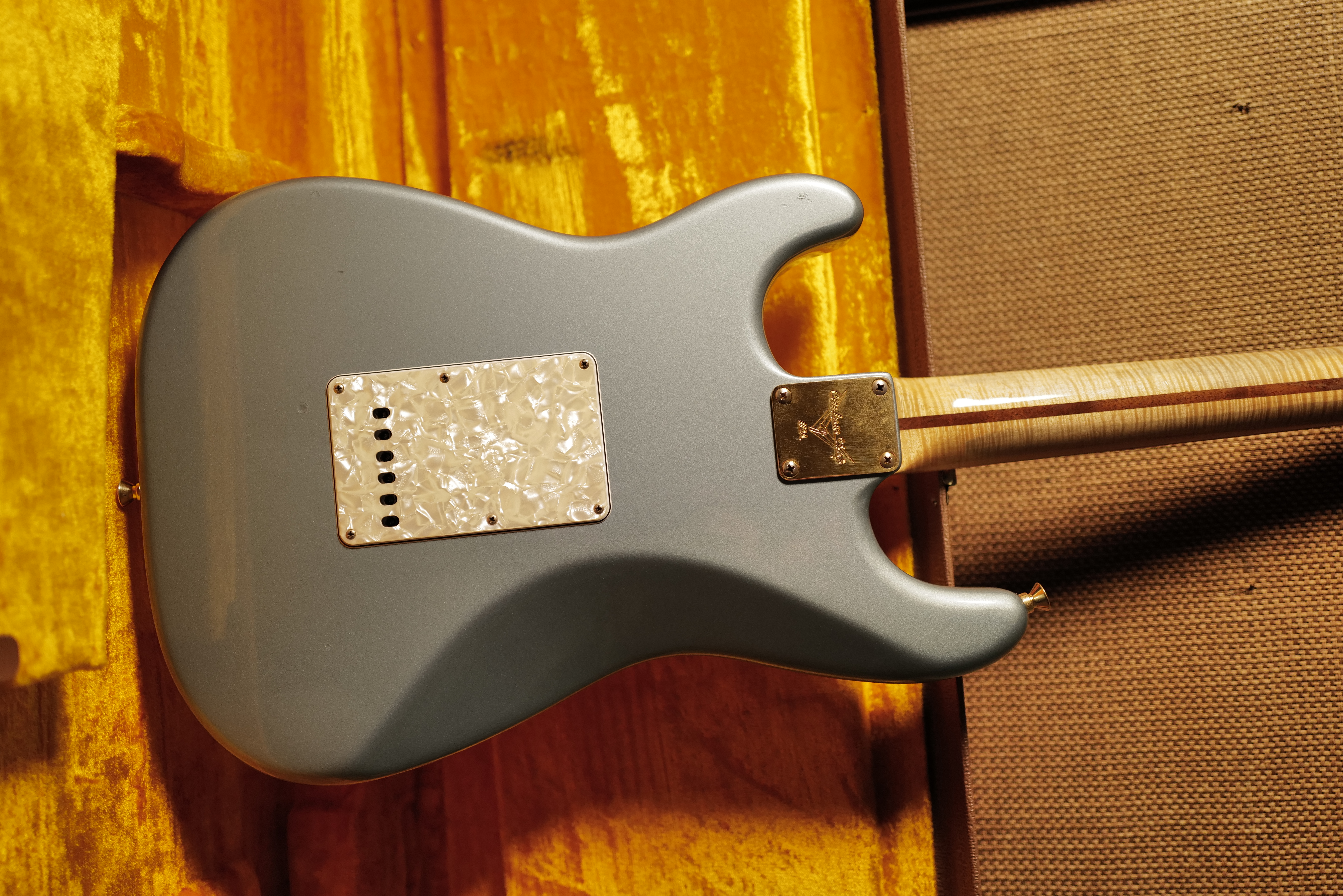 Built by Master Builder J.W. Black at the Fender Custom Shop, this instrument features a heavily figured one-piece maple neck with a 25.5-inch scale length, 22 frets, black dot position markers, and a beautifully aged satin finish. Hardware includes six gold-plated staggered vintage-style tuners, reflecting the guitar’s premium craftsmanship.
