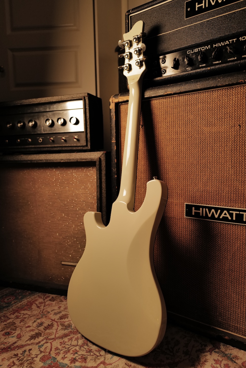 With its pristine white finish contrasted by block inlays and chrome hardware, it perfectly embodies the elegant and unique visual style associated with the band.