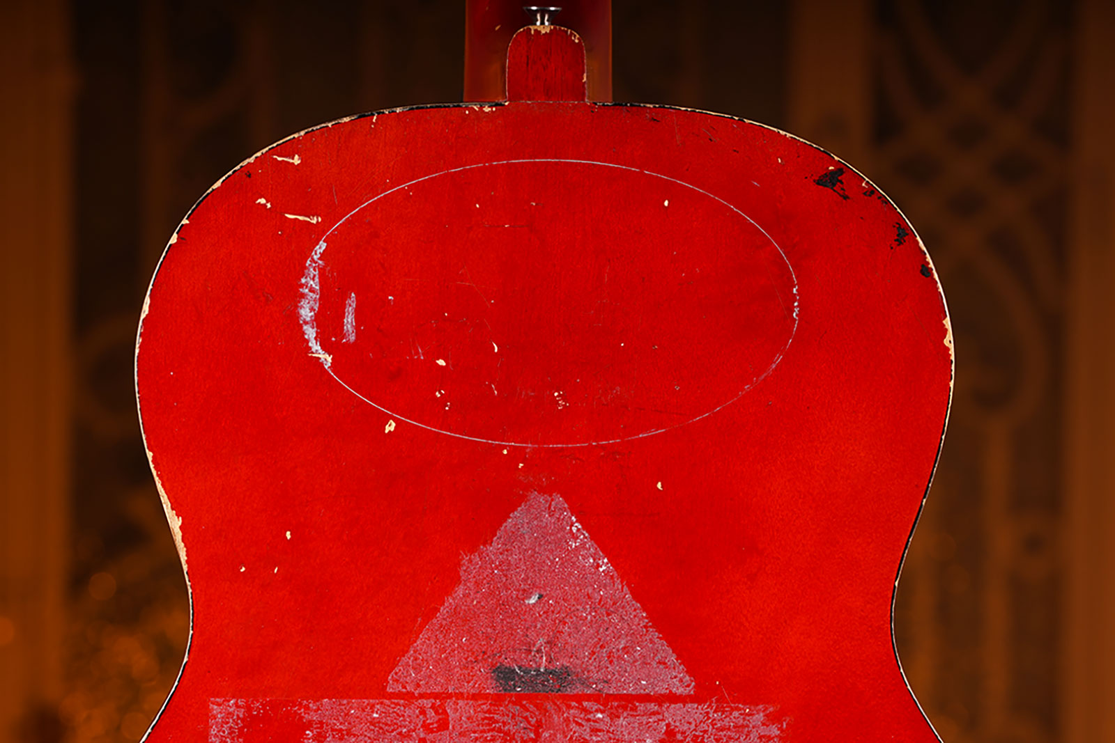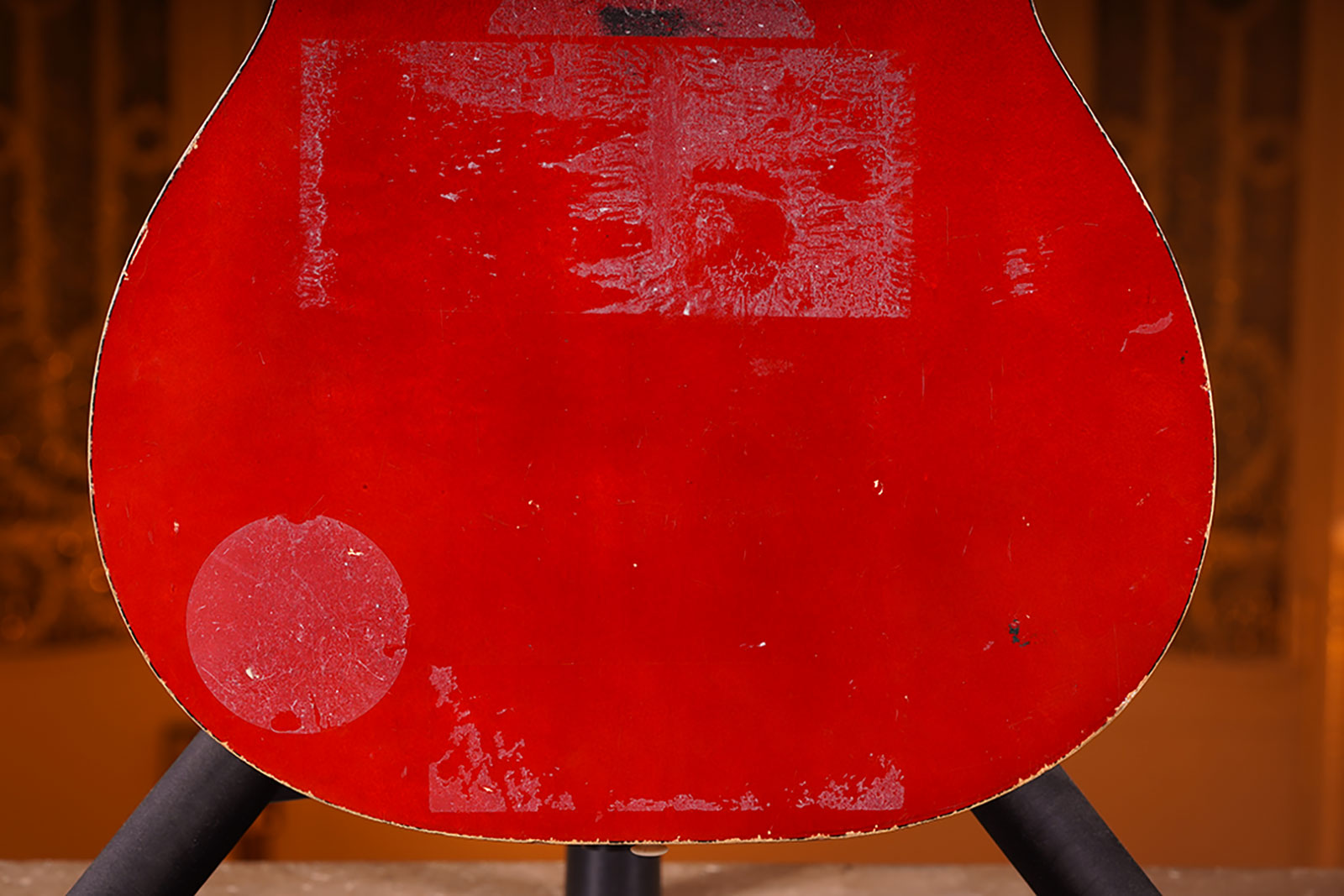 When John Frusciante gave an interview to VPRO in 1994, he was seen in his girlfriend's apartment feverishly clutching that orange guitar with the damaged body. Strumming it with the attachment of a broken man, John Frusciante shows his visceral connection to the guitar by playing in disarming distress. Drained by long months of addiction, he holds one of the last guitars still in his possession after having been separated from his most beautiful vintage instruments (sold like the mythical 1966 Jaguar of Under the Bridge or lost in the fire of his house). This very organic instrument has been the privileged witness of moments of a harsh reality, which the marks on the table remind us of by their gravity. If several changes are to be noted (like the bridge replaced and a microphone installed), its damaged orange table makes this instrument recognizable. It is the witness of the hardest hours of the tumultuous John Frusciante, who later managed to get out of the throes of depression and addiction.
