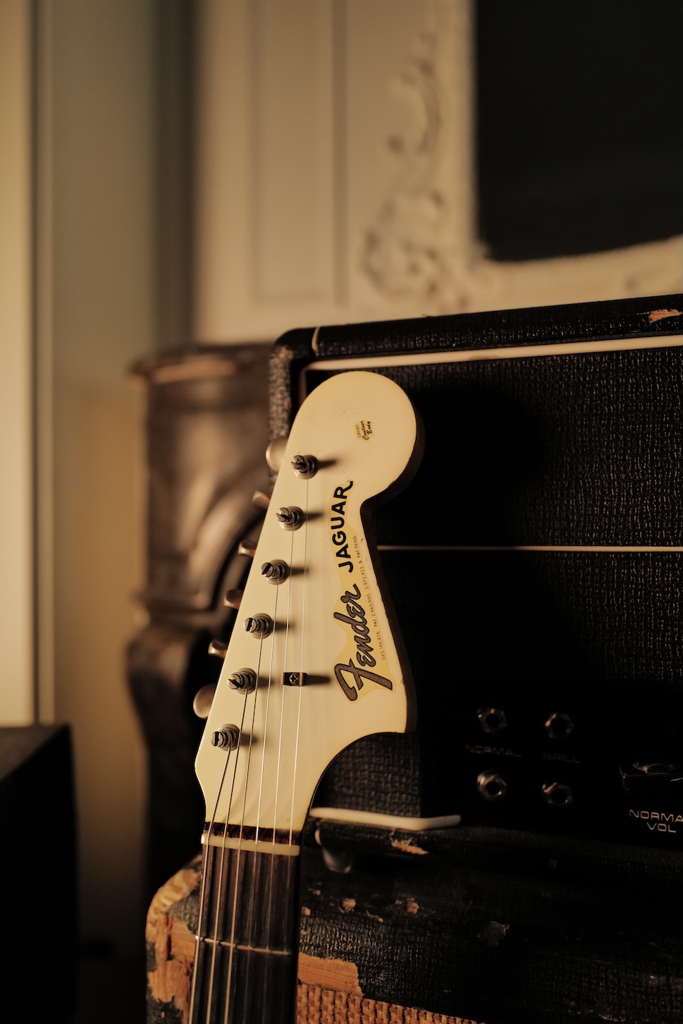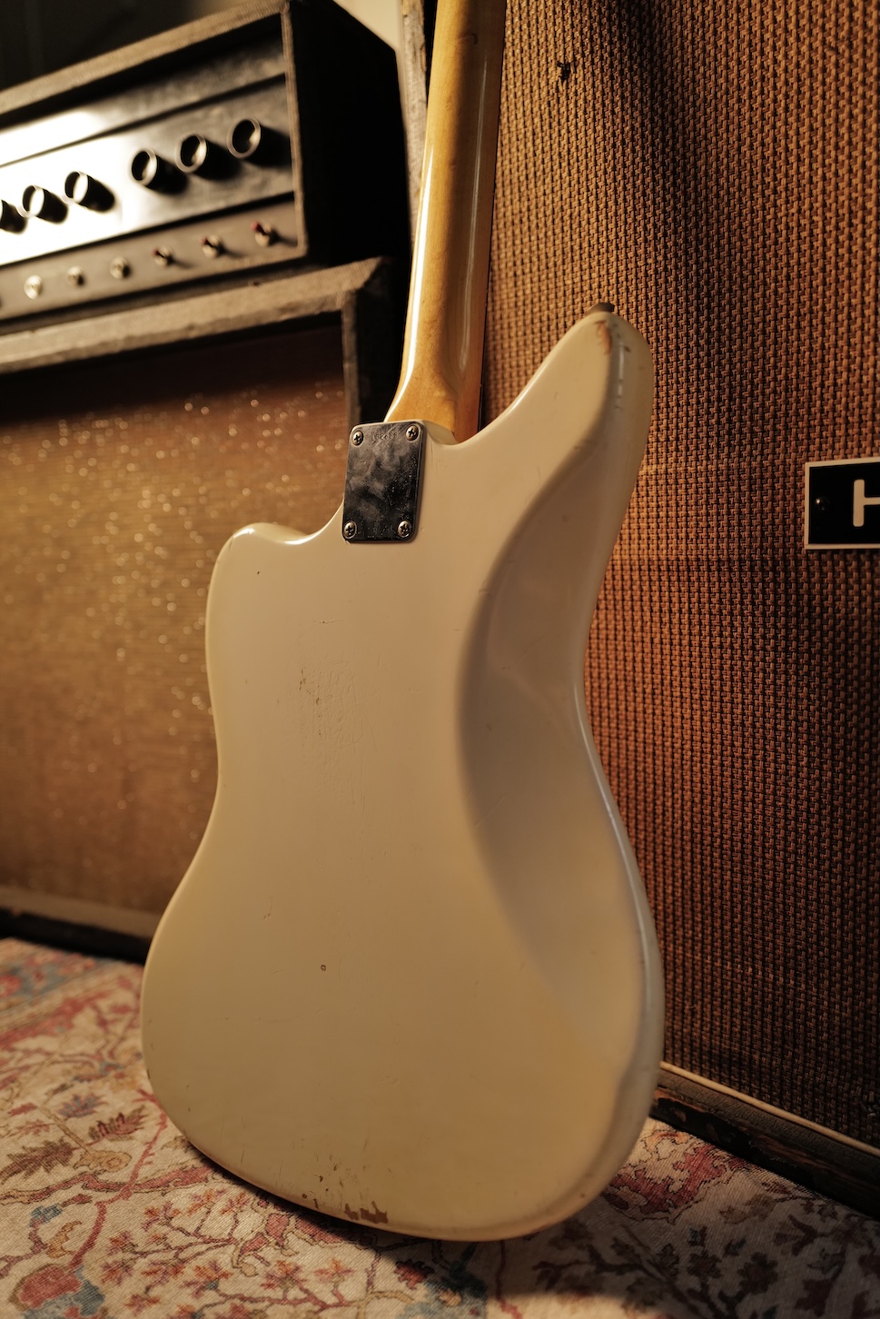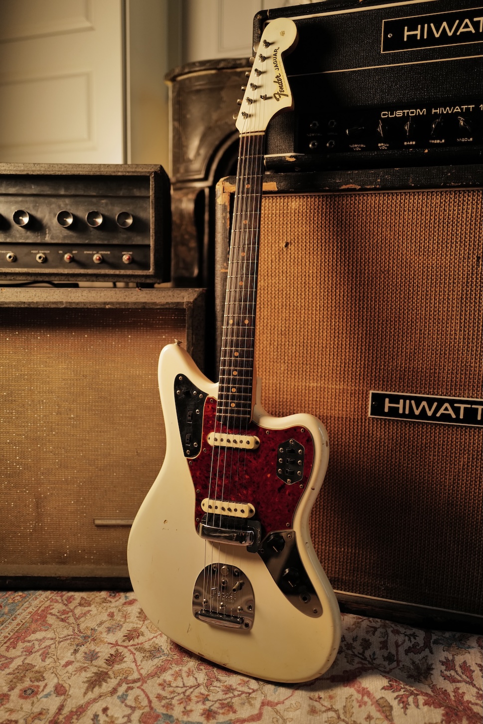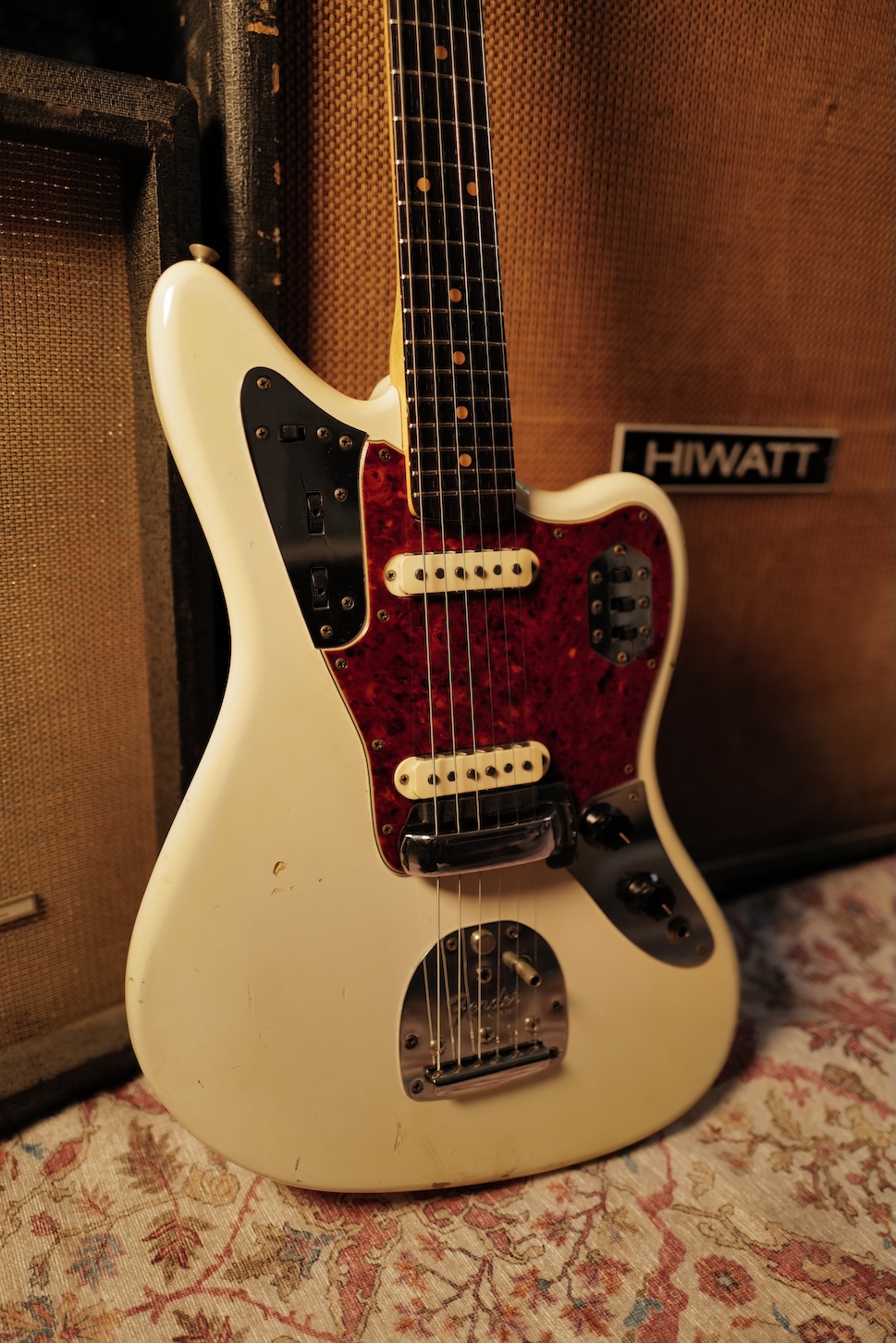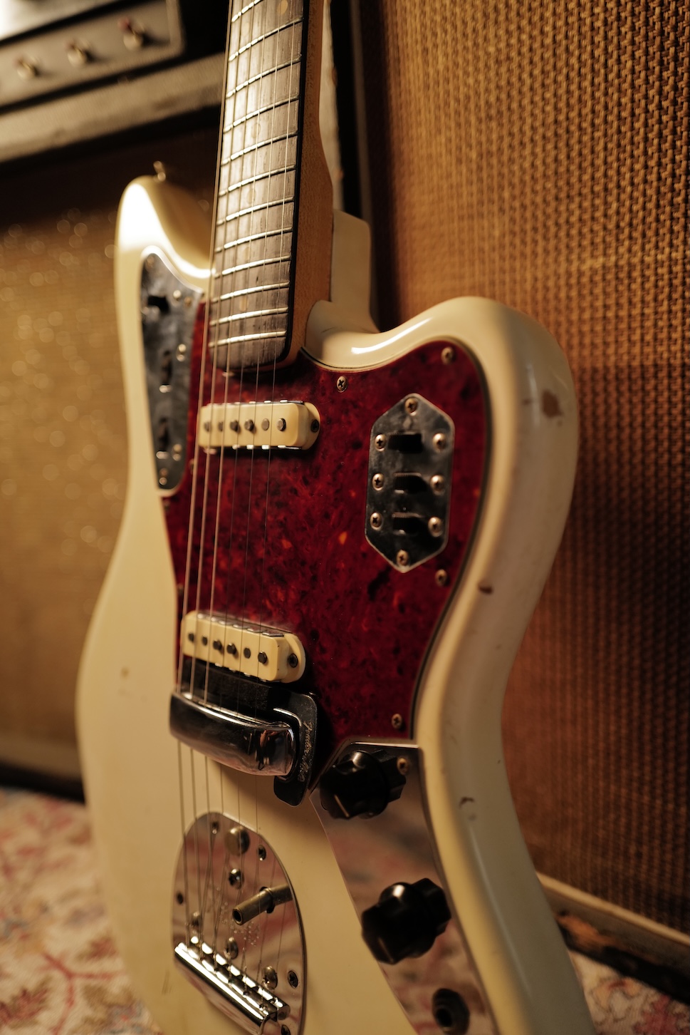 Cette Fender Jaguar de 1963 se distingue par sa finition Olympic White d’origine, aujourd’hui magnifiquement patinée par le temps.