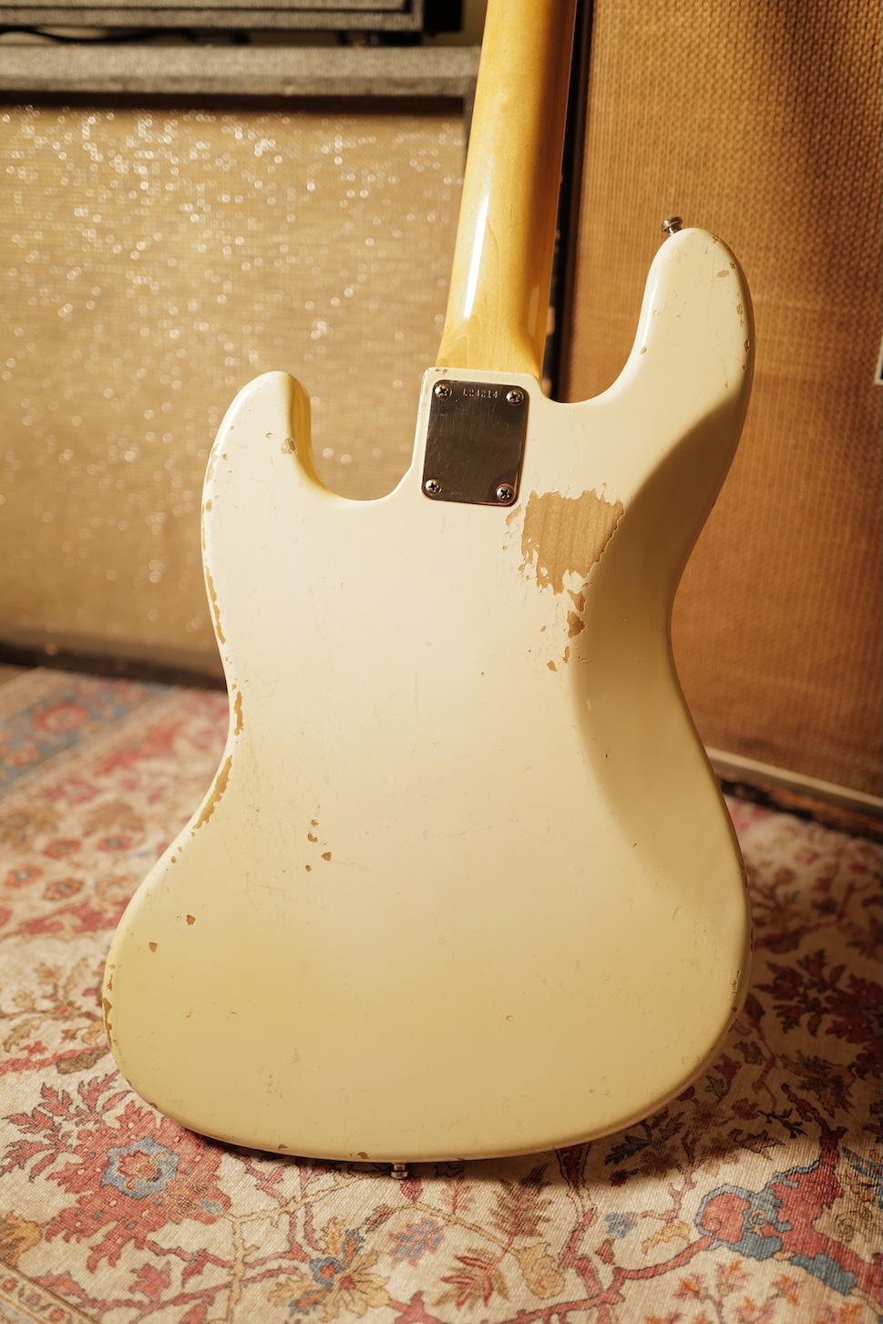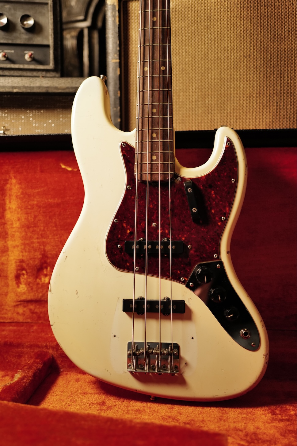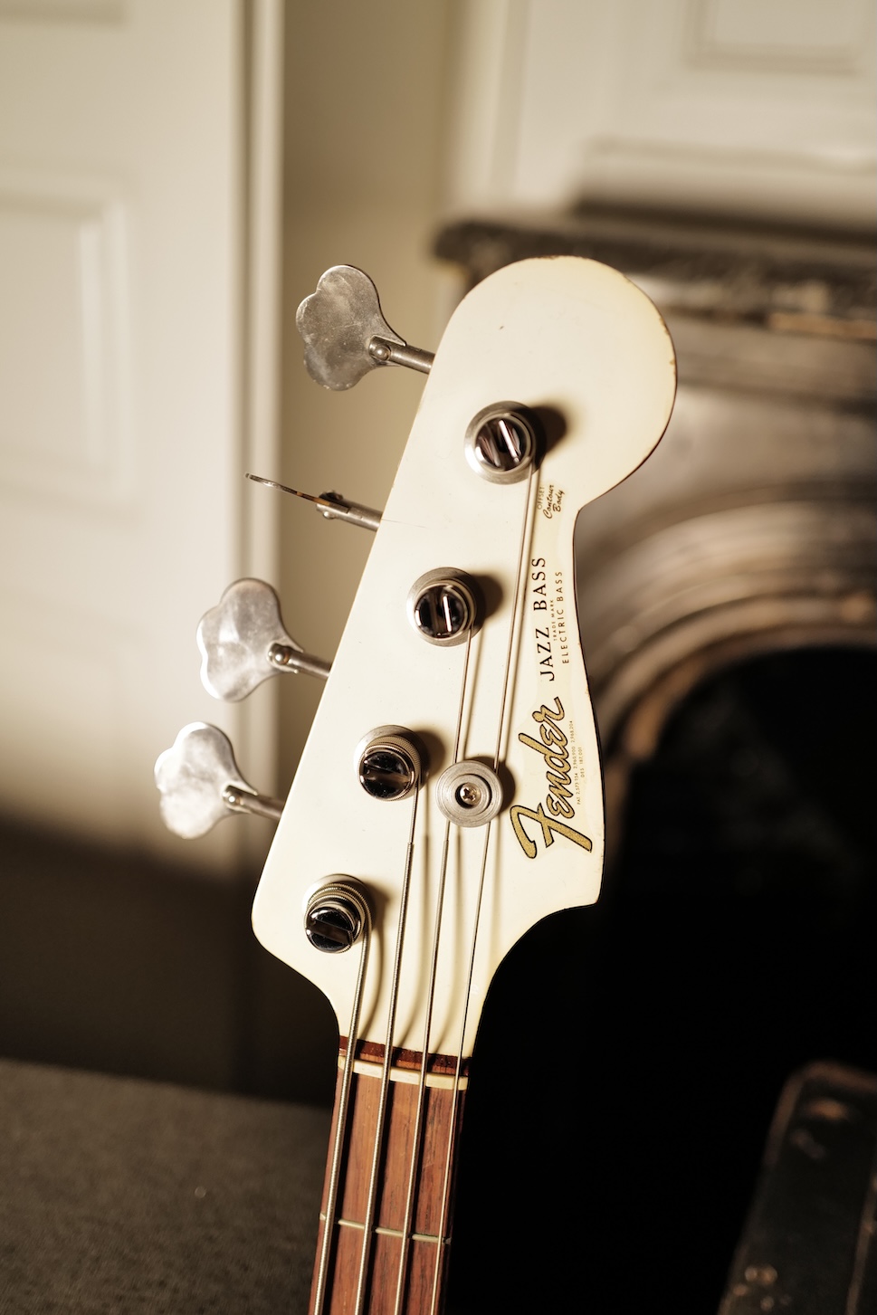 Cette Fender Jazz Bass de 1964, dans sa superbe finition Olympic White, est un instrument d’exception ayant appartenu à Adam Clayton, bassiste légendaire du groupe U2, l’une des formations les plus influentes de l’histoire du rock.