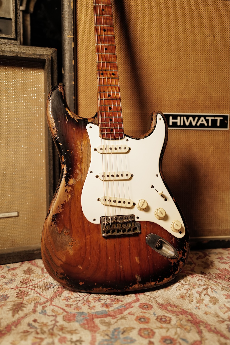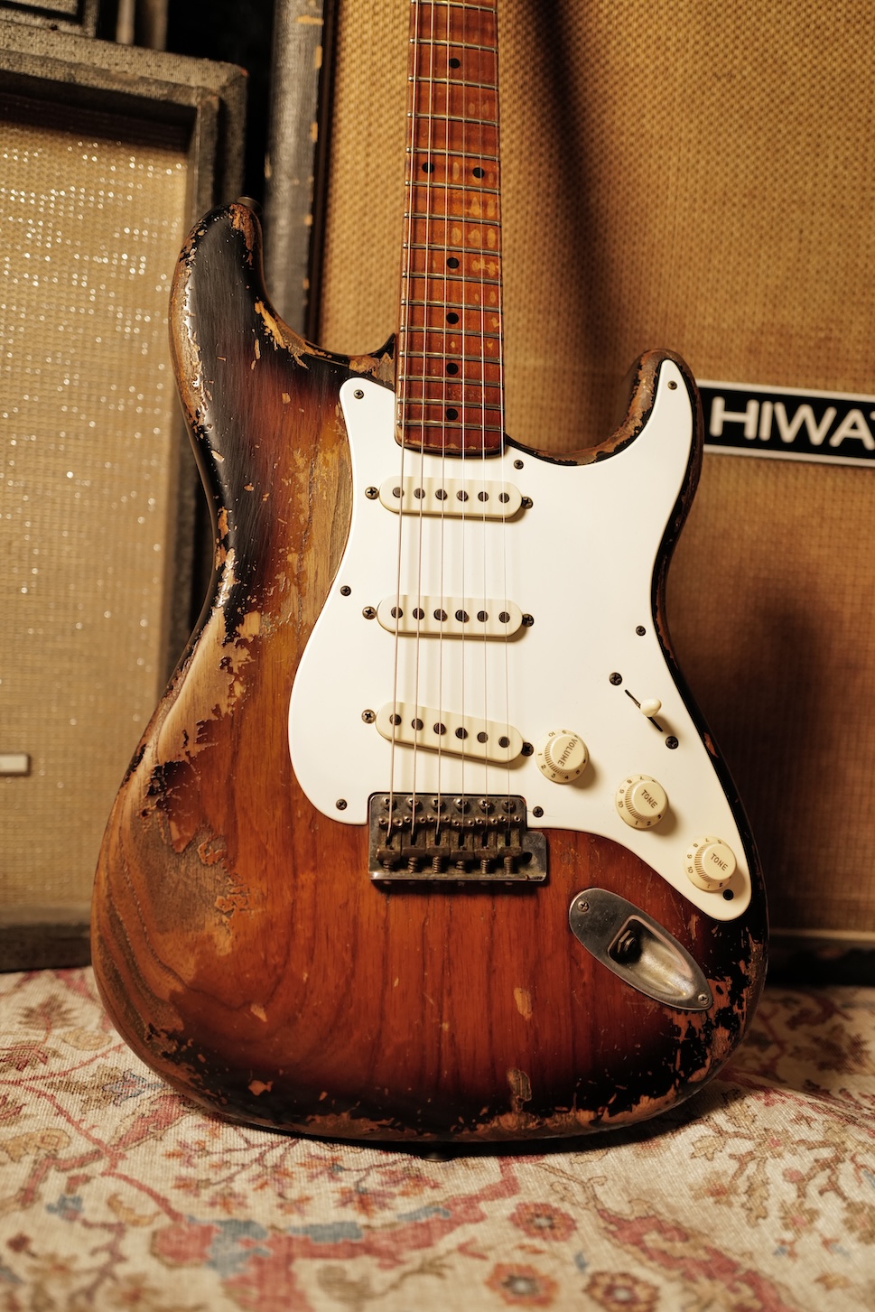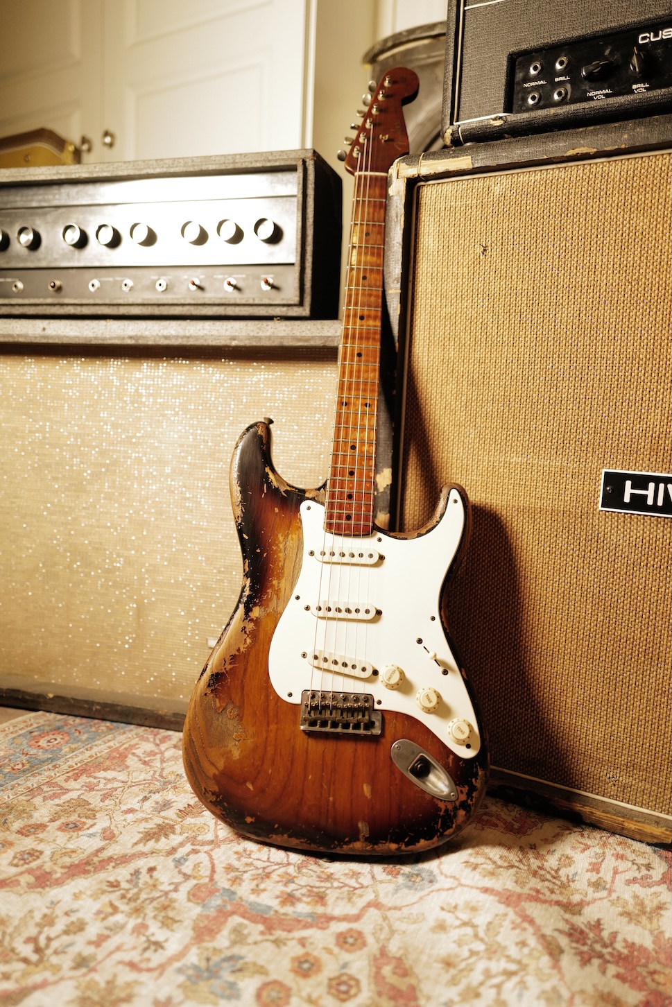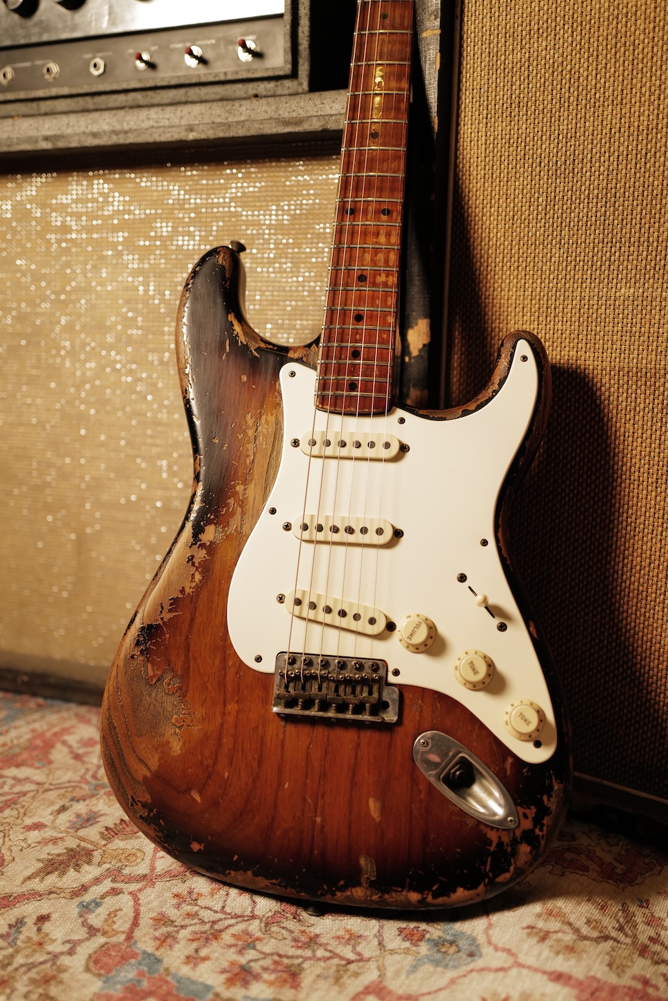 Proposée dans une finition Super Heavy Relic Sunburst, elle reflète un travail de vieillissement poussé, réalisé avec une précision et un sens du détail remarquables.