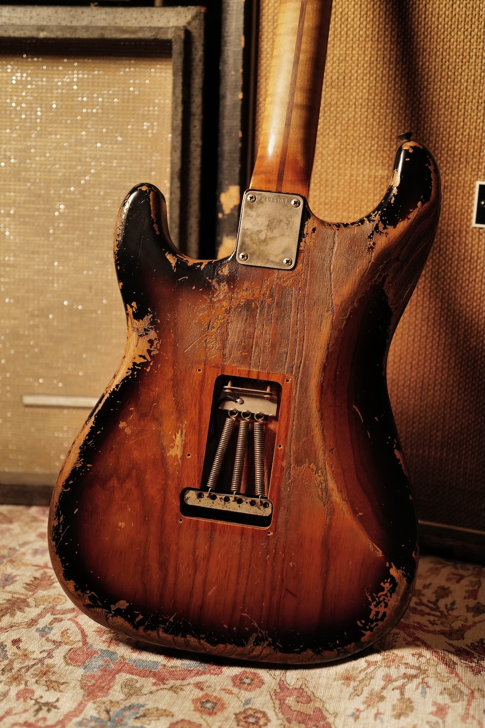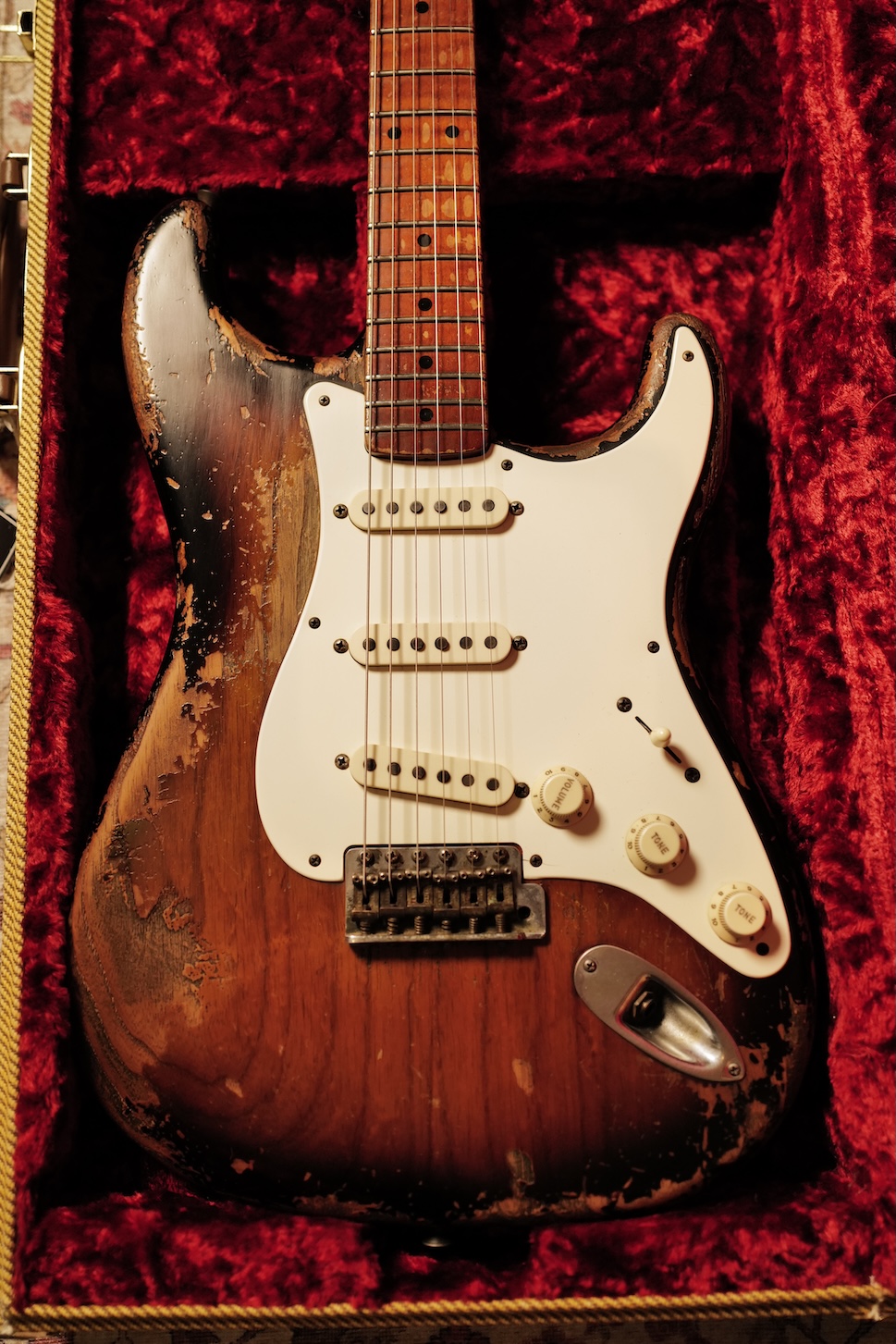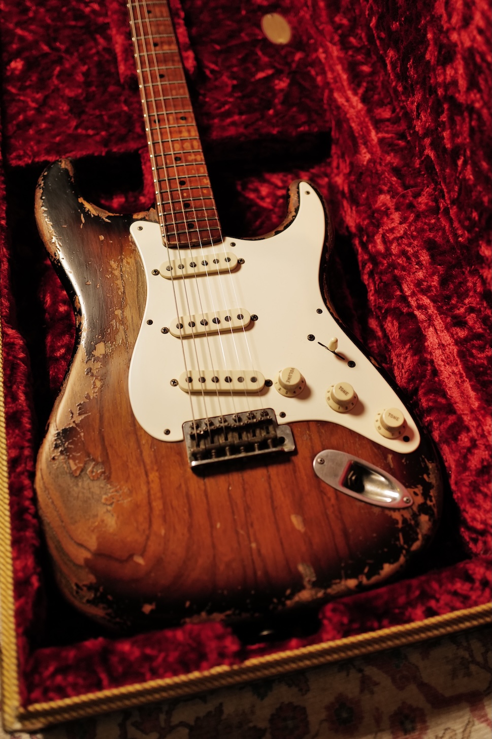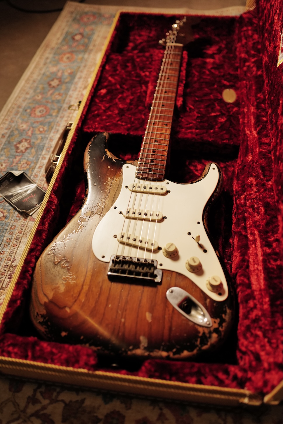 Proposée dans une finition Super Heavy Relic Sunburst, elle reflète un travail de vieillissement poussé, réalisé avec une précision et un sens du détail remarquables.